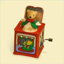 Hallmark Ornament. Dimensions: 3 1/2″H, Artist: Sharon Visker. Fourth in the series. Teddy bear pops up to “Pop! Goes the Weasel”