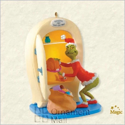 Hallmark Ornament. Dimensions: 3 3/4″H, Artist: Anita Marra Rogers. There is a light in the fridge and the ornament plays “You’re a Mean One, Mr. Grinch”. Issued as a Hallmark Gold Crown Exclusive. Available October.