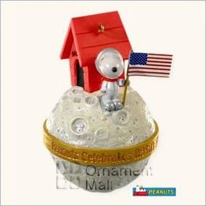 Hallmark Ornament. Dimensions: 5″H, Artist: Tracy Larsen. Snoopy is on the moon holding the American Flag to honor the launch of the space age and 50 years of NASA.