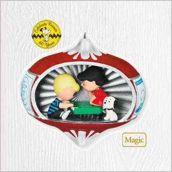 Hallmark Ornament. Dimensions: 3 1/2″ W. Battery operated. This ornament celebrates the 60th anniversary of Peanuts. It plays music from “The Waltz of the Flowers” and dialogue between Lucy and Schroeder.