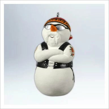 Hallmark Ornament. Dimensions: 3″ H, Artist: Sharon Visker. Snowman is ready to ride in his Harley-Davidson gear.