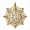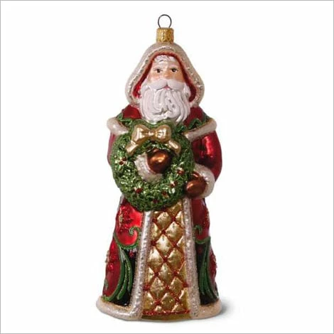 Artist: Edythe Kegrize. Dimensions: 3″ w. x 6.5″ h. x 2.5″ d. Handcrafted in Poland. Features a classic Old World Santa with red flowers and green floral lattice decorating his cloak. Hand-applied glass glitter and microbeads complete the design.