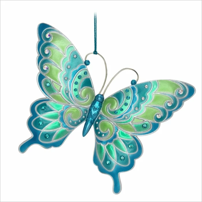 Third in the Brilliant Butterflies series, this luminous green and aqua-toned butterfly Christmas tree ornament features metallic and clear jewel accents. Embossed design on the butterfly’s body and bead-tipped antennae add grace and charm.