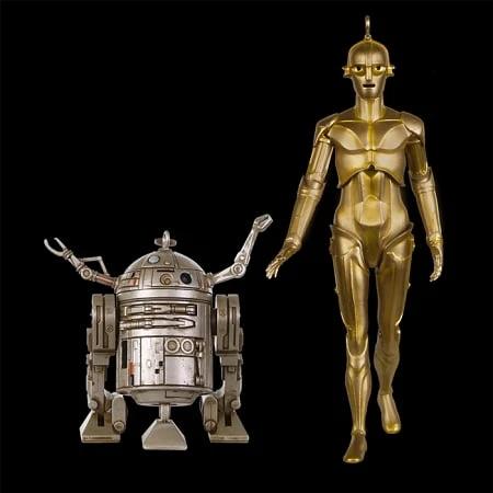 This ornament set is an event exclusive and one of 3000. Metal. Inspired by concept artwork from Star Wars A New Hope. Futurist and artist Ralph McQuarrie created many of the conceptual designs for the first Star Wars feature film, including the initial designs of the Droid duo of C-3PO and R2-D2. When first envisioned, the golden proto droid featured a much more humanoid face and figure, while the barrel-shaped Astro droid sported numerous appendages and vaulted rather than rolled from place to place.