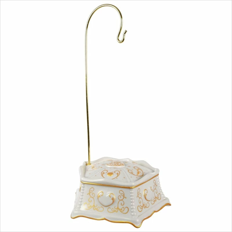 Put your favorite Disney Princess front and center with this premium ornament stand. Designed to coordinate with one of the leading ladies from the Disney Princess Celebration series, the elegant metal and porcelain piece features metallic gold accents and decorative icons for Cinderella, Sleeping Beauty, Snow White, Belle and Ariel on its ornate base.