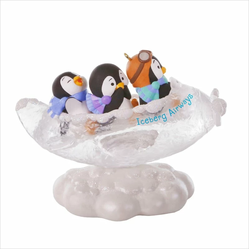 Who says penguins are flightless? This adorable Christmas tree ornament features three playful penguins in an ice-sculpted plane ready to soar into the wild blue yonder—or at least dangle awhile on your tree. Equipped with aviator glasses, one penguin sits in the cockpit with his friends behind him—one a wee bit afraid and the other laughing all the way. A dusting of glitter adds a frosty finish.