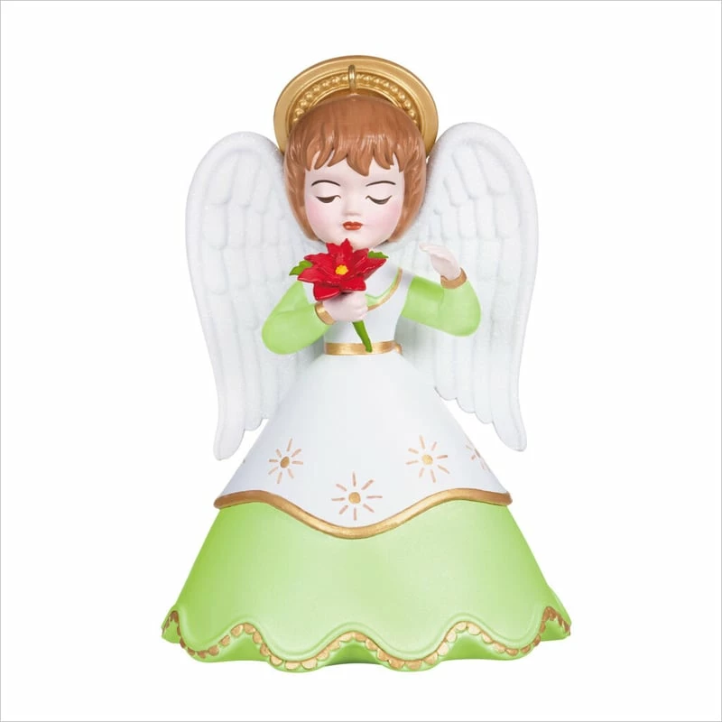 Share in the bountiful joy of the holidays when you display this vintage-inspired angel Christmas tree ornament. With a charming retro look, the sweet cherub holds a red poinsettia bloom and wears a pretty green-and-white gown accented with a gold halo and glittery wings.