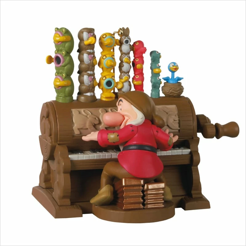 Fans of Disney’s “Snow White and the Seven Dwarfs” will rejoice in adding this lively Christmas ornament to their tree. Join the celebration when Grumpy plays the organ and the dwarfs sing “The Silly Song” after they discover Snow White in their home. Turn the crank on this delightful decoration to make the organ pipes move and listen to the funny tune from the classic animated film. Sound feature is battery-operated. Requires 2 LR44 batteries, included.