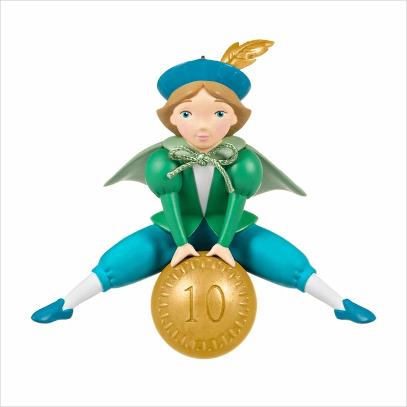 Continue your Twelve Days of Christmas collection with this year’s joyful addition. The little leaping lord—festively attired in a pantaloon ensemble, complete with a cape and feather in his cap—is posed mid-leap over a gold ball displaying the number “10.” The back of his cape features music notes and lyrics of the classic Christmas carol. 10th in the Twelve Days of Christmas Hallmark Series.