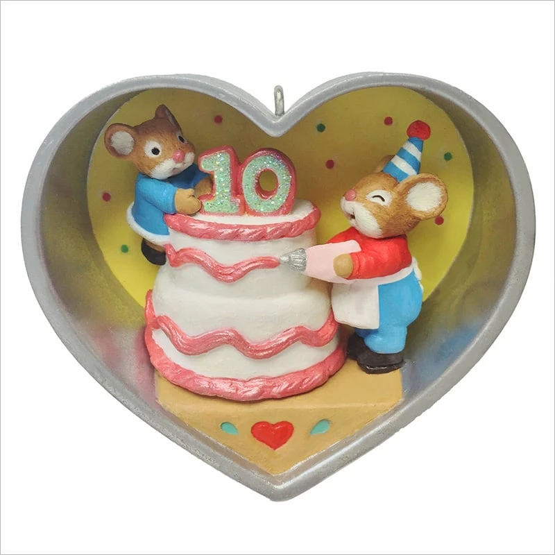 Join in celebrating 10 years of holiday fun with the Cookie Cutter Mouse series. This sweet Christmas tree ornament features the beloved little mouse wearing a party hat as he and his friend put the finishing touches on the grand cake that sits before them—complete with a glittery milestone topper. Coordinating 10th in series Cookie Cutter Christmas ornament sold separately.