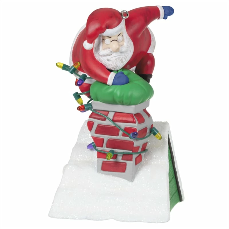 You’re never too old to believe in the magic of the season… though Santa himself might be feeling a little too old for this. This funny Christmas tree ornament features a grumpy Santa Claus, who’s clearly having a hard day as he tries to shove his overstuffed bag down the chimney. Plays Santa’s voice and music from “Up on the Housetop” (battery-operated).