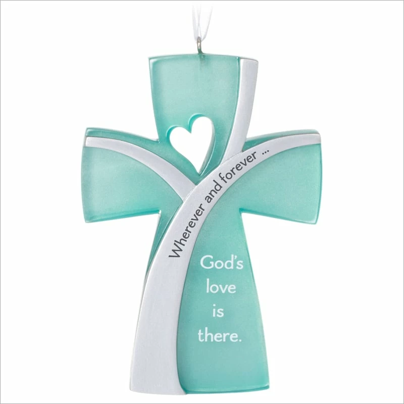 Artist: Terri Steiger, Dimensions: 2.9″ W x 4.1″ H x 0.5″ D. Express your faith at the holidays and every day with this inspiring cross Christmas tree ornament. The reassuring message, laser-cut heart and translucent sea glass-inspired design offer a sacred symbol of faith for your own home or a meaningful gift for friends and family.