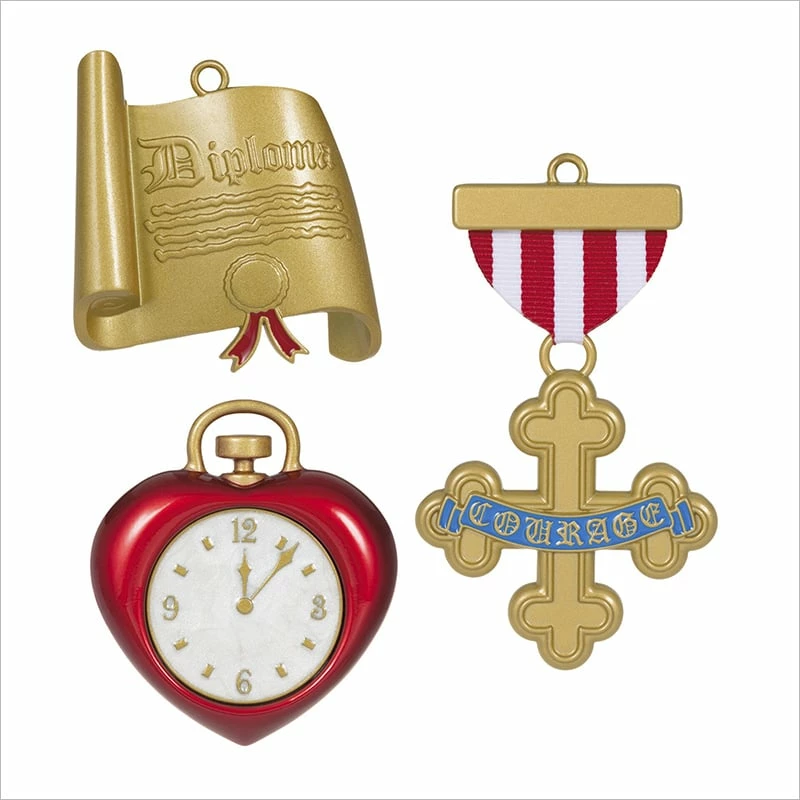 Cowardly Lion, Scarecrow and Tin Man learn they always possessed the courage, brains and heart they thought they lacked as they accompany Dorothy along the Yellow Brick Road. Fans of “The Wizard of Oz” will love to pay tribute to those special qualities with this collection of three premium metal Christmas tree ornaments featuring a diploma, a medal and a heart.