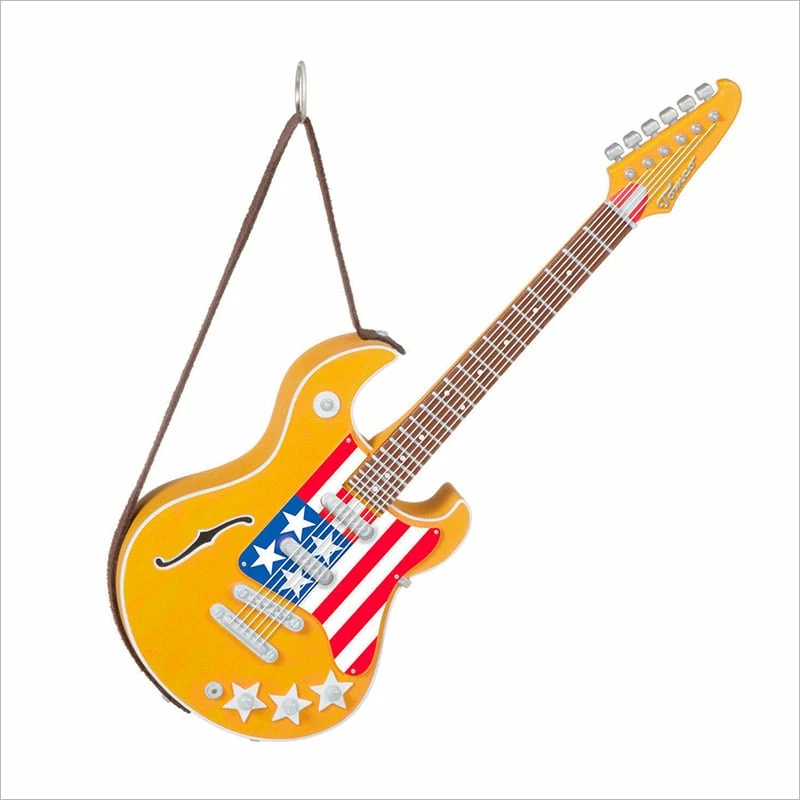 Rock through the holidays with this electric guitar Christmas tree ornament. Featuring a “Tomco” signature design, this star-spangled guitar decoration plays part of the rock classic “American Woman” performed by The Guess Who (battery-operated).