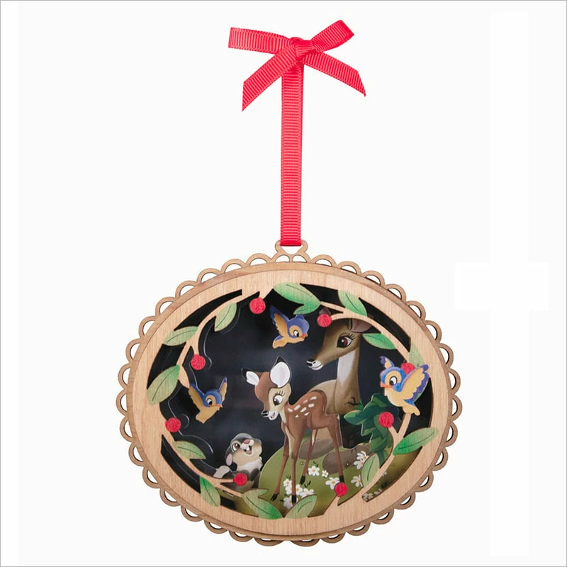 Treasure the joys of family and friendship with this sweet Christmas tree ornament. Pretty laser-cut wood frames an intricate papercraft scene featuring Bambi and his mother gathered in the woods with his bunny friend, Thumper, and blue birds. Celebrate the 80th anniversary of the classic animated movie with this charming decoration that makes a wonderful gift for Disney fans of all ages.