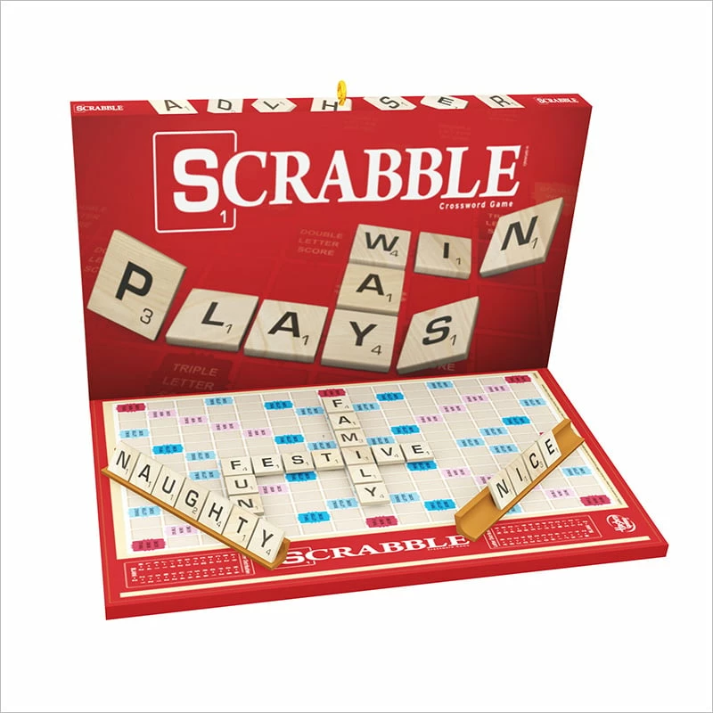 Relive competitive holiday Scrabble games with this Christmas tree ornament celebrating the popular crossword board game. The whole family will enjoy the memories of family game night and time spent playing together with this classic design that includes tiles arranged in festively themed combinations.