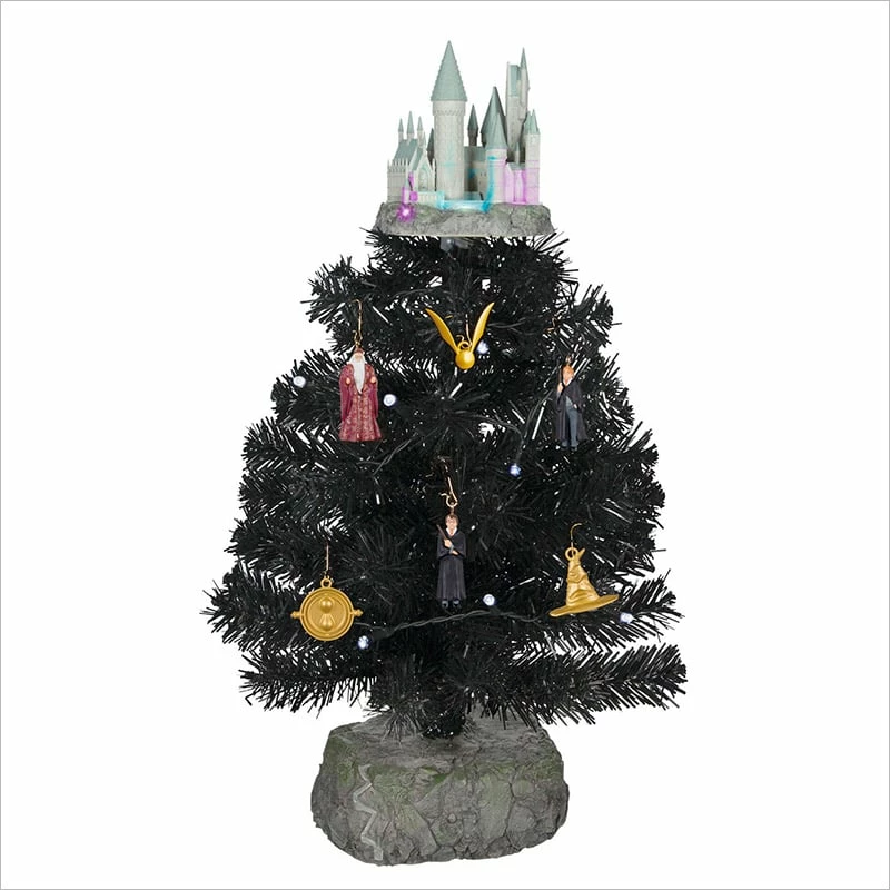 Cast enchanting appeal on your holiday decorating with this stately Wizarding World table decoration set. The tabletop Christmas tree features a sturdy base with a Hogwarts grounds design, school castle tree topper and six miniature ornaments, including Harry Potter, Ron Weasley, Dumbledore, the Golden Snitch, Sorting Hat and Time-Turner. Connect to the included power adapter for continuous light on the castle and prelit tree, then press the button on the base to hear music from “Hedwig’s Theme.”