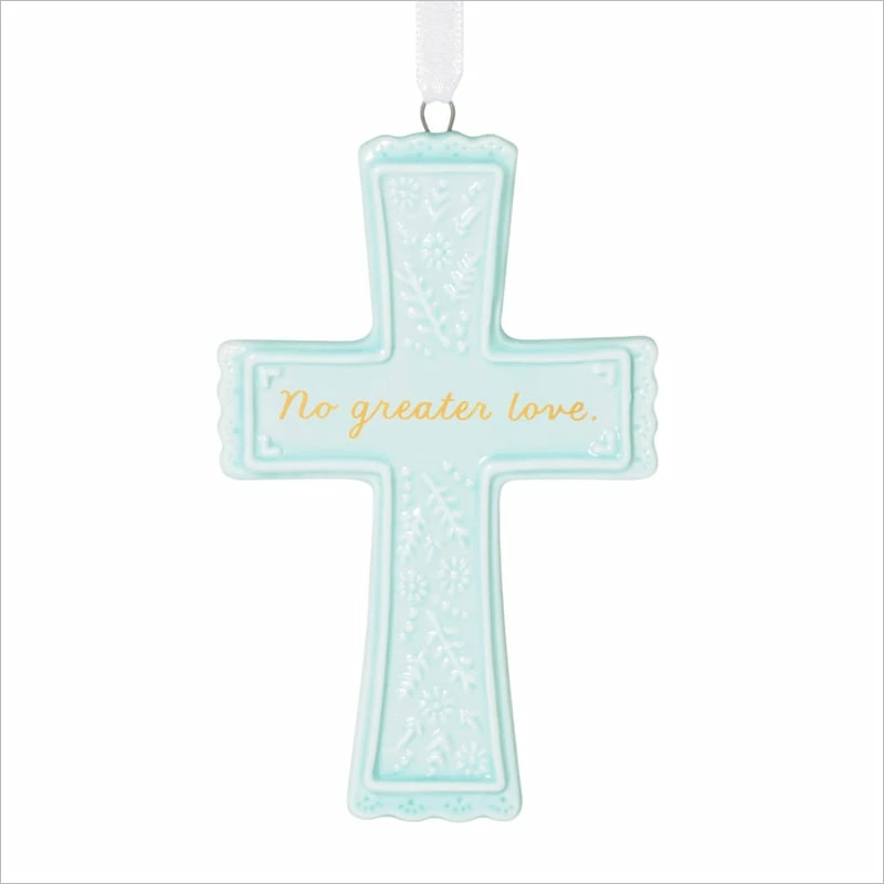 Express your faith at the holidays and every day with this pretty aqua blue porcelain cross Christmas tree ornament. The inspirational message and embossed floral design offer a sacred symbol of faith for your own home or a meaningful gift for friends and family.