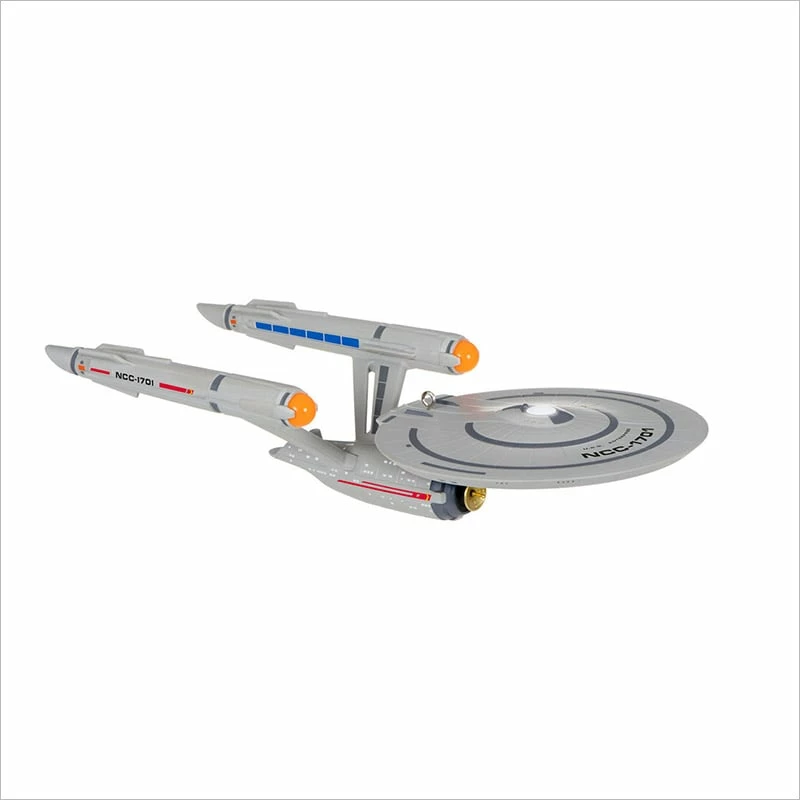 Before the arrival of James T. Kirk, the flagship of Starfleet was commanded by Captain Christopher Pike with a devotion to the values of the United Federation of Planets. Boasting a design that was introduced in “Star Trek: Discovery” and later appeared in “Star Trek: Strange New Worlds,” this U.S.S. Enterprise Christmas tree ornament lights up at the touch of a button (battery-operated).