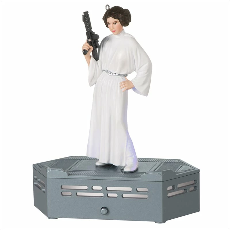 Captured while transporting stolen plans for the Death Star, Princess Leia Organa of Alderaan issued a desperate plea for Obi-Wan Kenobi’s assistance and demonstrated unwavering determination, defying Darth Vader and Grand Moff Tarkin. This Christmas tree ornament features the tenacious Rebel Alliance leader. Plug the ornament into Hallmark’s Keepsake Power Cord (sold separately) for constant illumination, then press the button to start an epic sound and light show scene. Connect all of the Star Wars: A New Hope Storytellers ornaments—Luke Skywalker, Obi-Wan Kenobi, C-3PO and R2-D2, Princess Leia Organa, Darth Vader, Han Solo and Chewbacca—and the Death Star Tree Topper (each sold separately) to unlock additional amazingly interactive performances.