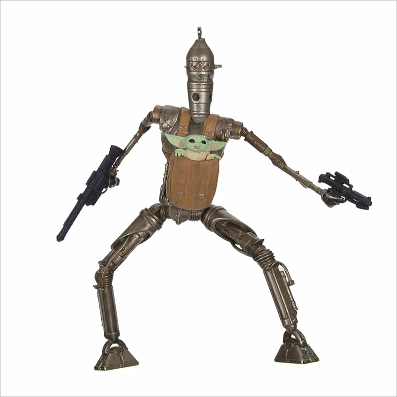 A reprogrammed former assassin droid, IG-11 fought alongside Din Djarin and his allies in the Disney+ original series The Mandalorian. This Christmas tree ornament features the dutiful droid defending the Force-sensitive child named Grogu.