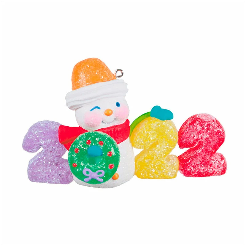 Celebrate a year to remember with this cute Christmas tree ornament. Featuring gumdrop numbers and a glittery snowman holding a wreath in place of the “0” for “2022,” this decoration is perfect for anyone with a sweet tooth. Year dated 2022. 3rd in the Sweet Decade Keepsake Ornament series.