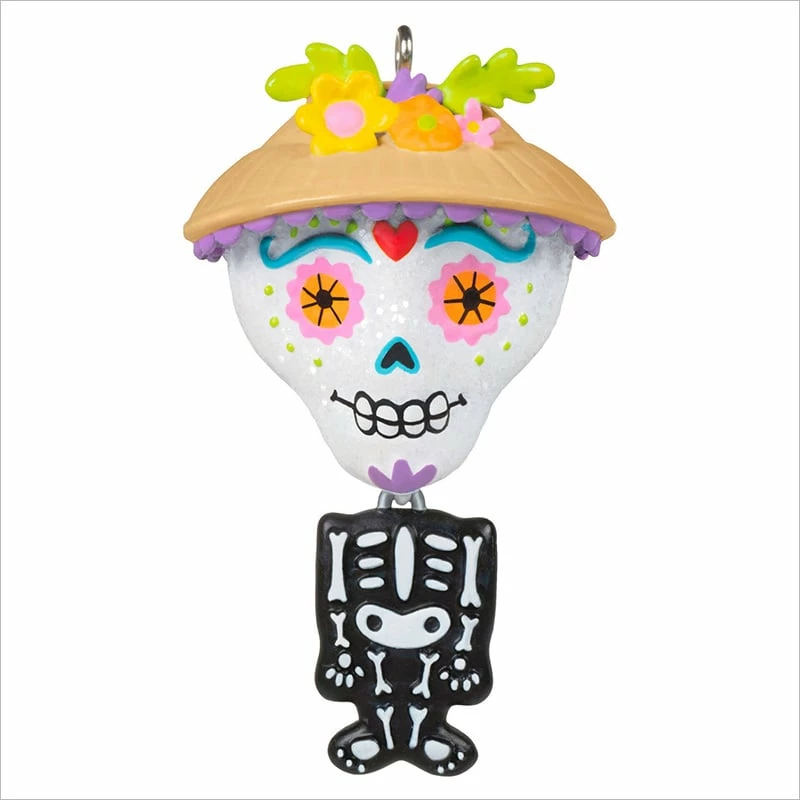 Celebrate el Dia de los Muertos when you display this miniature Hallmark Keepsake ornament that features a sparkly, traditional sugar skull head with dangling skeleton body.